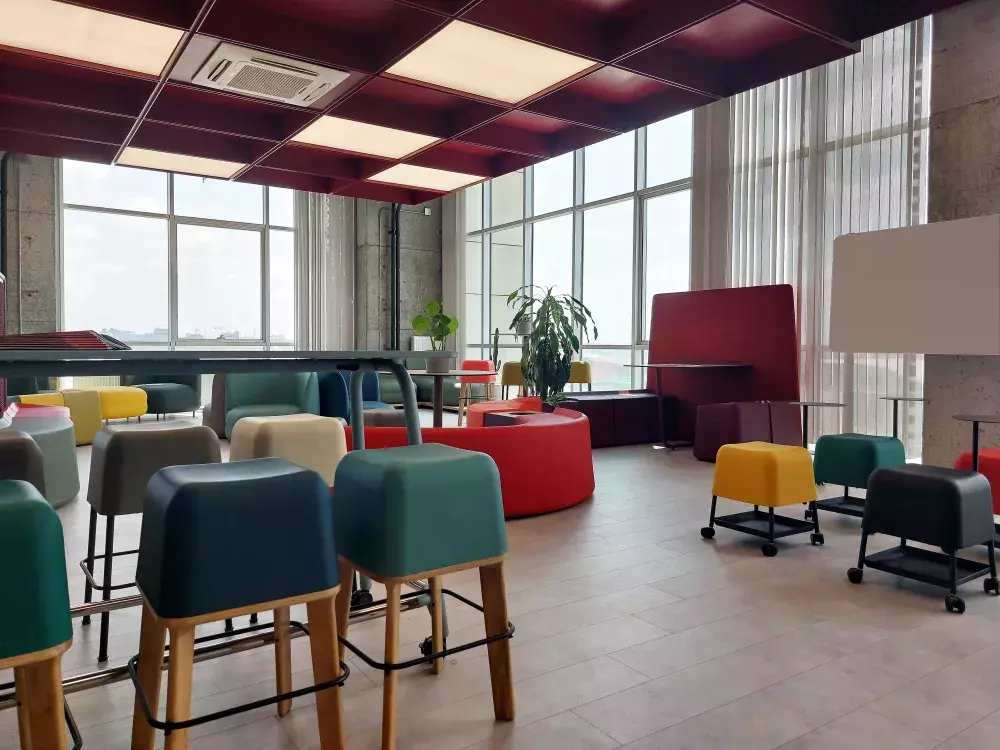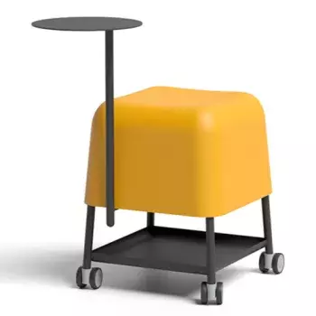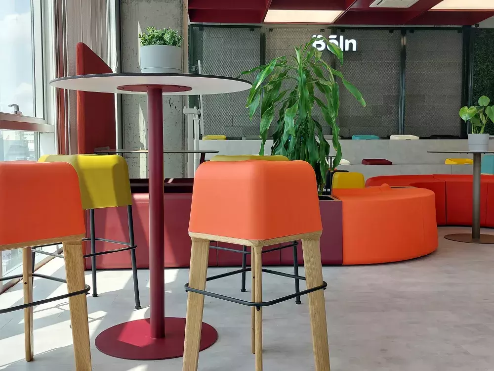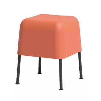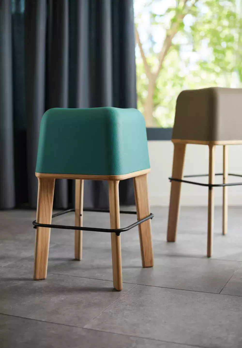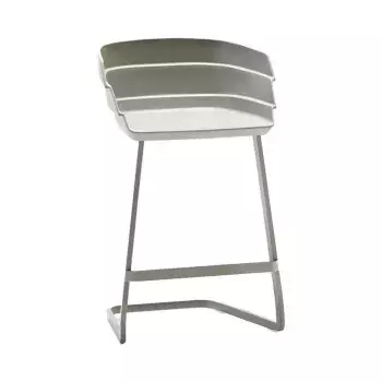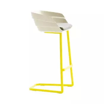 High stool made of Flexyskin with wooden legs and metal footrest.